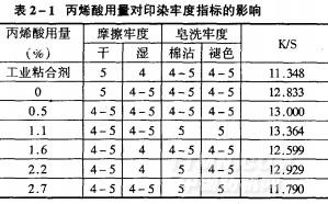 將不同用量的從作為自增稠單體加入,在其他條件不變的情況下,合成不同乳液用于涂料印花,并測試其印染指標如表2~1所示: