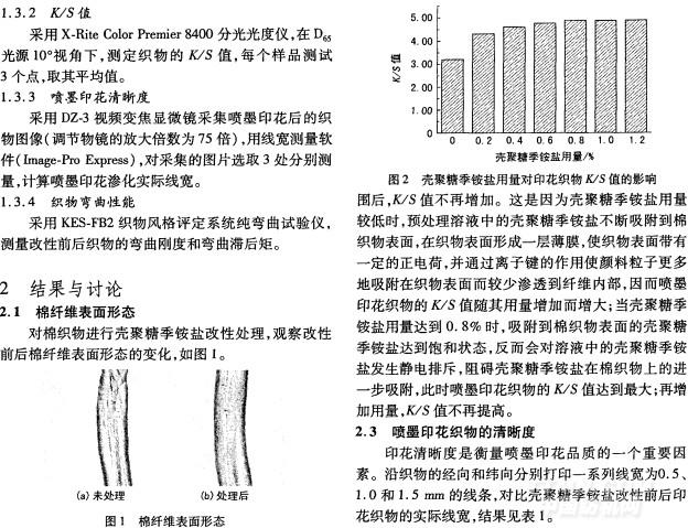摘 要:采用殼聚糖季銨鹽對(duì)棉織物進(jìn)行改性處理,探討了改性處理對(duì)棉織物水性顏料墨水噴墨印花性能的影響。結(jié)果表明,經(jīng)殼聚糖季銨鹽改性后,棉纖維表面變得光滑,并形成一層薄膜;殼聚糖季銨鹽改性可提高噴墨印花織物的K/S值,當(dāng)殼聚糖季銨鹽用量為0.8%時(shí),K/S值由原先的3.20提高到4.87;噴墨印花的防滲化性能得到增強(qiáng),印花清晰度提高,打印0.5 mm線條時(shí),處理后織物經(jīng)緯向的實(shí)際線寬清晰度分別提高16.5%和12.6%;改性后印花棉織物的彎曲剛度和彎曲滯后矩略有增加,織物手感略微變差。