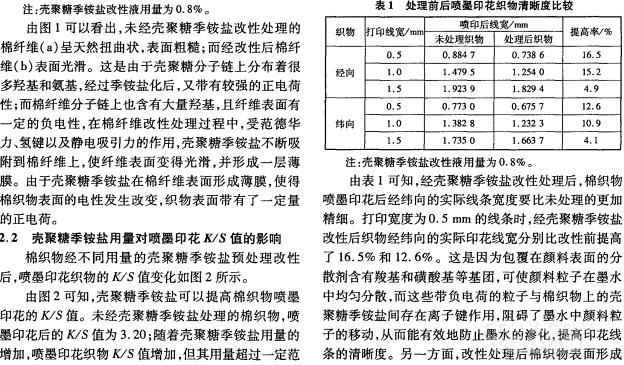 本試驗(yàn)采用自制的殼聚糖季銨鹽對(duì)棉織物進(jìn)行改性預(yù)處理,觀察棉纖維改性前后表面形態(tài)的變化,探討殼聚糖季銨鹽改性對(duì)棉織物水性顏料墨水噴墨印花的K/S值、印花清晰度、印花效果及織物手感的影響。