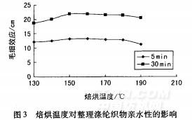 由圖3可見,焙烘溫度低于150cI=時,處理滌綸織物毛效隨溫度的增加而提高。隨著焙烘溫度的上升,PEE熔融流平,與滌綸織物表面共熔結晶完整性好,從而表現(xiàn)出良好的親水性;當焙烘溫度超過150℃并繼續(xù)提高時,因為PEE分子中親水性鏈段聚醚結構很容易氧化,其氧化后生成過氧化物并分解成自由基進一步加速氧化,導致聚醚結構破壞,使親水性有所下降。