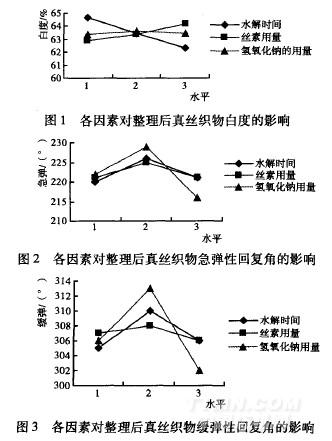 (1)絲素水解時(shí)間A對(duì)各指標(biāo)的影響:從折線圖可以看出,水解時(shí)間越長(zhǎng),白度隨之降低,急彈回復(fù)角與緩彈回復(fù)角隨之先增大后減小,斷裂強(qiáng)力也有少許減小,增重率先增大后減小。結(jié)合極差分析表,對(duì)白度來(lái)說(shuō),水解時(shí)間的極差最大,因此取水平1較好;對(duì)急彈、緩彈與增重率,水解時(shí)間影響適中,則取水平2;對(duì)斷裂強(qiáng)力,取水平1或2均可。隨著絲素水解時(shí)間的延長(zhǎng),被整理織物的急彈、緩彈均有一定程度的增加,到30min時(shí)達(dá)到最大;但當(dāng)超過(guò)30min后,折皺回復(fù)角變化不大,甚至略有減小。這是因?yàn)殚_(kāi)始時(shí)水解時(shí)間不足,絲素水解不充分,絲素整理劑的分子量很大,只能吸附或覆蓋于纖維表面。隨著絲素水解時(shí)間的延長(zhǎng),絲素大分子鏈不斷地發(fā)生斷裂,生成了各種分子量較低的多肽分子,這些多肽分子量越小,分子越小,越容易進(jìn)入纖維內(nèi)部微小的空隙中,而絲素分子的大小也決定著跟檸檬酸復(fù)配時(shí)相互混合的均勻程度。絲素分子太大,就不能與檸檬酸混合均勻;而絲素分子太小,則檸檬酸與絲素分子之間因太充分的交聯(lián)反應(yīng)而使整理劑中能與織物發(fā)生交聯(lián)的基團(tuán)大大減少,因而整理失去了意義。綜合5個(gè)指標(biāo)的變化情況,水解時(shí)間以30min為最佳。