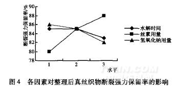 (3)氫氧化鈉用量C對(duì)各指標(biāo)的影響:隨著氫氧化鈉用量的增加,白度基本保持不變,急彈與緩彈先增后減,斷裂強(qiáng)力隨之減小,增重率先增后減。結(jié)合表3分析,對(duì)急彈、緩彈回復(fù)率,氫氧化鈉用量的影響最大,取水平2最好;對(duì)斷裂強(qiáng)力來(lái)說(shuō),氫氧化鈉用量影響適中,可取水平1。氫氧化鈉用量對(duì)白度、增重率的影響最小,取水平2。隨著NaOH質(zhì)量一體積分?jǐn)?shù)的增加,被整理織物的急彈和緩彈先增大后減小。當(dāng)NaOH為3g/L時(shí),織物的折皺回復(fù)角最大,超過(guò)3g/L時(shí)折皺回復(fù)角開(kāi)始減小。這是因?yàn)镹aOH的質(zhì)量一體積分?jǐn)?shù)過(guò)大時(shí),絲素水解加快,絲素分子量過(guò)小,浸軋時(shí)與蠶絲纖維的吸引力減小,能附著在纖維上的絲素分子減少,經(jīng)過(guò)焙烘與纖維發(fā)生的交聯(lián)也大大減少。而在NaOH質(zhì)量一體積分?jǐn)?shù)適宜的情況下,絲素分子被分解成的多肽分子的大小也適宜,這不僅有利于滲透到蠶絲內(nèi)部的空隙中,均勻分布于織物內(nèi),焙烘后更有利于交聯(lián)。綜合各項(xiàng)因素,NaOH質(zhì)量一體積分?jǐn)?shù)以3g/L為宜。綜合考慮,氫氧化鈉用量取水平2,即3g/L為好。