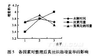 (2)絲素整理劑用量對(duì)各指標(biāo)的影響:隨絲素整理劑用量增加,白度略有提高,急彈與緩彈先增大后有所降低,斷裂強(qiáng)力和增重率隨之增加。結(jié)合表4看出,對(duì)斷裂強(qiáng)力與增重率,絲素用量的極差最大,取水平3最好;對(duì)白度,絲素用量影響適中,取水平3最好;對(duì)急彈與緩彈來(lái)說(shuō),取水平2或3均可。織物的急、緩彈折皺回復(fù)角隨著絲素整理劑用量的增加而增大,到30g/L時(shí)達(dá)到最大,4Og/L時(shí)有所降低。這是由于絲素整理劑用量過(guò)大時(shí),大部分絲素分子只能附著在纖維表面,只有一部分分子進(jìn)入蠶絲纖維內(nèi)部的縫隙中。隨著絲素溶液用量的增加,纖維間的黏附力及交織點(diǎn)的黏結(jié)作用增強(qiáng),折皺回復(fù)性有所下降,手感變硬。對(duì)于白度、斷裂強(qiáng)力、增重率3個(gè)性能來(lái)說(shuō),絲素用量取40 L最好,綜合考慮5個(gè)指標(biāo),絲素整理劑用量取40g/L較好。