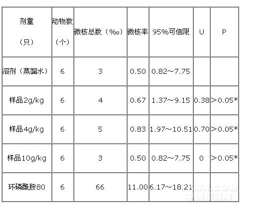 *樣品各組與溶劑對照組微核發(fā)生率比較,無顯著差異(P>0.05)。