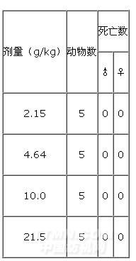 4.2.4.1試驗方法:試驗動物為中國醫(yī)學科學院動物中心提供的二級昆明種小鼠(合格證號為醫(yī)動字第01-3001號),雌、雄各20只,體重為18-22克,按霍恩氏法選用經口一次灌胃染毒,給藥前12小時禁食,給藥量最大體積為0.4ml/20g體重。染毒后觀察二周,記錄中毒癥狀及死亡時間,根據動物死亡數,從霍恩氏LD50計算表,求出LD50值及可信限。