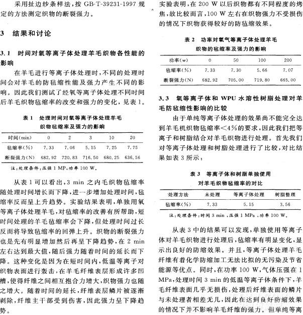 摘 要:文章討論了低溫等離子體對羊毛織物防氈縮性能的影響,分析了低溫等離子體處理時間和功率對羊毛織物的氈縮率及斷裂強力的影響,比較了樹脂整理與低溫等離子對羊毛織物防氈縮性能的影響,得出了最佳工藝:處理時間:3 min,壓強:1 MPa,處理功率100 W,樹脂用量:4O g/L。