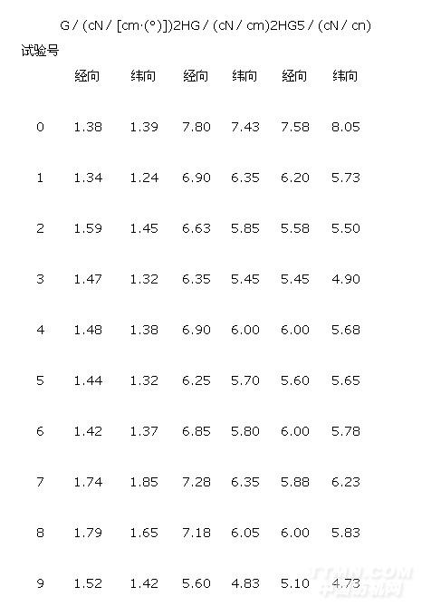 測試織物剪切性能,包括剪切剛度(G),0.5下剪切滯后力(2HG)和5°下的剪切滯后力(2HG5)。測試結(jié)果見表8。