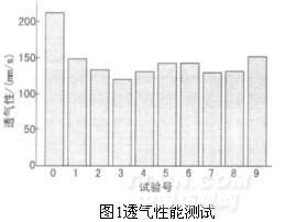 試驗(yàn)采用了YG461E數(shù)字式透氣量儀,其吸風(fēng)功率大,傾斜壓力計可以與垂直壓力計構(gòu)成低壓透氣量儀,擴(kuò)大了織物可測的范圍[5]。根據(jù)1.2.5節(jié)透氣性能測試,試驗(yàn)結(jié)果如圖1所示。