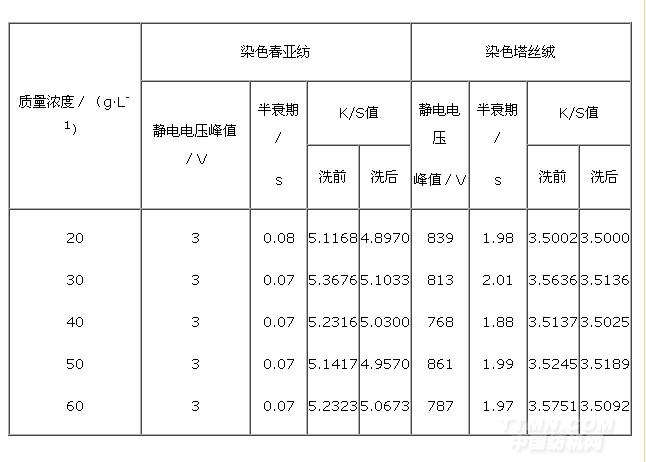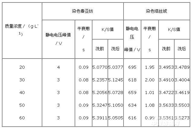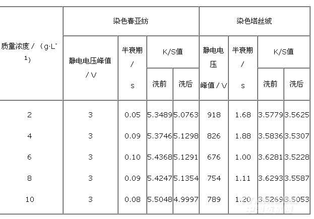 表2 抗靜電劑質(zhì)量濃度對織物抗靜電性能的影響