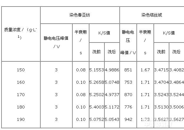 采用單因素法,用抗靜電劑TF-480分別對染色春亞紡和染色塔絲絨進行處理,測試其整理效果,優(yōu)化抗靜電劑質(zhì)量濃度、焙烘溫度、處理時間和交聯(lián)劑用量。