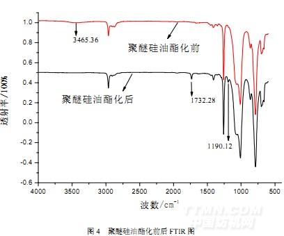 由圖4可知,聚醚硅油酯化前的紅外譜圖中,1061.6cm-1、1028.3cm-1180為聚醚硅油Si-O-Si的特征峰,1260cm-1、804.3cm-1為聚醚硅油Si-CH3的特征峰,3465.3cm-1為聚醚硅油—OH的特征峰。與酯化前聚醚硅油的紅外譜圖對(duì)比,酯化后聚醚硅油的紅外譜圖中,歸屬為聚醚硅油Si-O-Si的特征峰1061.6cm-1、1028.3cm-1均存在。但歸屬為聚醚硅油的—OH的特征峰3465.3cm-1在酯化后已經(jīng)消失,并在1732.2cm-1出現(xiàn)了—C=O的特征峰以及在1190.1cm-1出現(xiàn)了—C-O-C的特征峰,表明酯化產(chǎn)物中有酯鍵生成。酯化產(chǎn)物在1600-1650cm-1未出現(xiàn)雙鍵特征峰,原因可能是雙鍵所占整個(gè)硅油的比例太低,吸收峰太弱不明顯所致。產(chǎn)物的紅外譜圖分析表明丙烯酸通過(guò)酯鍵接枝到聚醚硅油。