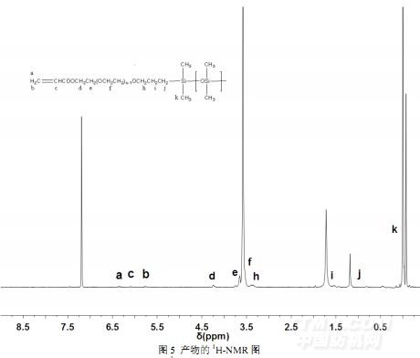 聚醚硅油酯化產(chǎn)物主要質(zhì)子的核磁譜圖結(jié)果如圖5所示,其中分子鏈中各個(gè)質(zhì)子振動(dòng)峰對(duì)應(yīng)的具體化學(xué)位移(δ)如下:k(0.08),Si-CH3;j(1.2),Si-CH2;i(1.71),Si-CH2CH*2CH2O;h(3.37),Si-CH2CH2CH*2O;f(3.54),-(CH2CH2O)-;e(3.65),CH*2CH2OOCCH=CH2;d(4.32),CH*2OOCCH=CH2;c(6.05),CH*=CH2;a(5.80)、b(6.43),CH=CH*2;7.25為CDCl3溶劑峰。這些峰說(shuō)明合成產(chǎn)物分子中不僅含有骨架聚硅氧烷鏈段,還含有酯基、聚醚、乙烯基等基團(tuán),并且產(chǎn)物的結(jié)構(gòu)基本與設(shè)計(jì)式結(jié)構(gòu)一致。