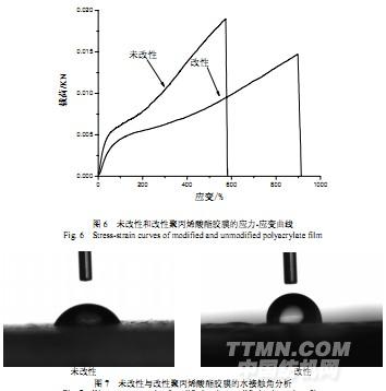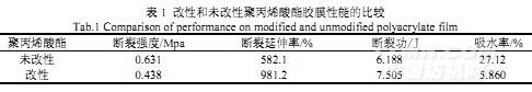 采用自制的雙端丙烯?;勖压栌?,按1.2.2方法合成改性聚丙烯酸酯,測定了其膠膜性能,并與未改性的聚丙烯酸酯進(jìn)行了比較,結(jié)果如表1,圖6、7所示。