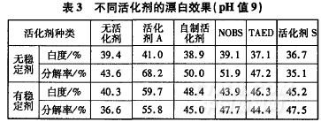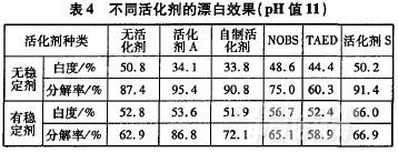 由表3可以看出,在80oC、pH值9且無穩(wěn)定劑的條件下,除活化劑s以外,其它幾種活化劑對雙氧水的分解均有較明顯的促進(jìn)作用。從白度上看,與空白樣相比,僅有活化劑A對織物的白度有一定的提升;而活化劑NOBS、TAED和活化劑S的加入,都使織物白度有一定的下降。因此,漂白條件為80℃、pH值9時(shí)選用活化劑A。但是活化劑A對雙氧水分解率的提高程度遠(yuǎn)遠(yuǎn)大于對白度的提高程度,這可能是由于1.2X10-3g/L的質(zhì)量濃度對活化劑A來說已經(jīng)過量,導(dǎo)致雙氧水分解迅速。