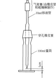 加入30ml已知硬度水(1000mg/kg),蓋上量簡塞子后如前進(jìn)行混合,重復(fù)操作5次。然后將量筒放在恒溫水浴中,在溫度(40±0.5)℃下保持5min,如前再次混合,重復(fù)操作5次。然后將一支上端用氣密塞密閉的l0ml移液管,放置量筒中,使尖嘴離量筒底部約lcm(圖1)。
