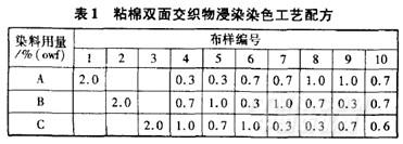 采用Dataeolor 650測配色儀,以粘膠面為標(biāo)樣,棉面為批次樣,分別測試粘棉雙面交織物的附(加權(quán)強(qiáng)度)和△H (色相)。Wgt反映表觀色深和顏色濃淡的相近程度;△H則反映了色相或色調(diào)的相近程度。Wgt值越接近100% ,△H在一1~+1之間,則同色性越好。