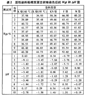 選用的活性染料采用60℃浸染法染色,其中K型染料采用兩種工藝(60℃浸染和95℃浸染)染色,按表1所示染料用量染色,然后測試織物的Wgt和△H值,結(jié)果見表2。