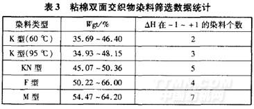 對(duì)每種類型染料的Wgt范圍和△H在一1~+1間的數(shù)目進(jìn)行統(tǒng)計(jì),結(jié)果見(jiàn)表3。