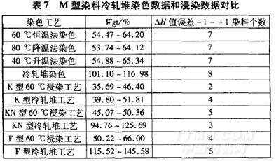 將四種活性染料浸染工藝和冷軋堆工藝的統(tǒng)計(jì)數(shù)值進(jìn)行對(duì)比分析,見(jiàn)表7。