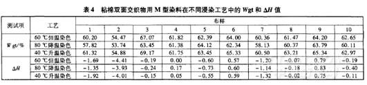 M型染料選擇60℃ 恒溫染色,80℃ 降溫染色和40℃ 升溫染色,染色結(jié)果見(jiàn)表4。