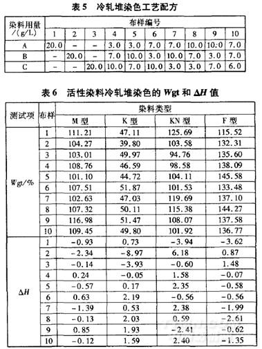 四類染料采用冷軋堆染色工藝,按表5工藝單獨(dú)染色,結(jié)果見(jiàn)表6。