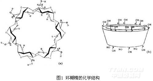 是六個以上葡萄糖分子以α—1,4糖苷連接的環(huán)狀低聚物,其中葡萄糖殘基呈4C1椅式結(jié)構(gòu)如圖(9)1(a)所示。最常見的是α—環(huán)糊精(r—CD),β—環(huán)糊精(β—CD)和γ—環(huán)精精(γ—CD);分別由六個、七個和八個葡萄糖分子構(gòu)成。經(jīng)X—射線衍射和核磁共振研究證明:環(huán)糊精的立體結(jié)構(gòu)是中空兩端開口的錐形園環(huán)形(或稱喇叭形環(huán))如圖1(b)所示。呈近似Cn軸對稱,結(jié)構(gòu)穩(wěn)定,不易受酸、矸、酶和熱作用而分解。