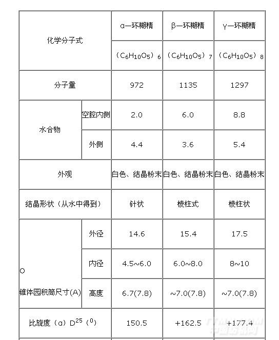 商品環(huán)糊精的純度可達99%,含水分為9%±1%,灰分0.02%以下。α—、β—和γ—環(huán)糊精三個品種的主要性能如表1,所示。