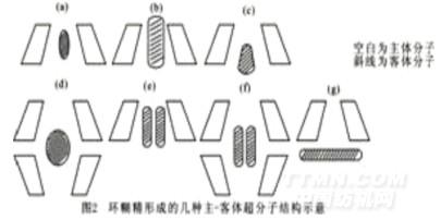 如果客體分子的整體或部分處于環(huán)糊精的空腔中,則屬于包合物(Inclusion Compounds),如果客體分子躺在環(huán)糊精空腔某一端則屬締合物(Association Compounds),如圖2(19)所示.圖2中(a)表示主、客體分子1:1完全包合,如苯分子被β-環(huán)糊精包合;(b)表示部分包合,如偶氮染料分子的偶氮基(-N=N-)被α-或β-環(huán)糊精包合;(c)表示端基部分包合,如萘紅分子用α-環(huán)糊精包合只能形成這種包合;(d)是2個(gè)γ-環(huán)糊精分子包合單一的C60富勒烯分子的是2:1包合物實(shí)例之一;(e)(f)分別表示1:2包合物及橋連型2:2主客體包合物;而(g)表示一種締合物,如多極性基的大環(huán)化合物,諸如冠醚、氮雜冠醚與環(huán)糊精容易形成締合物。