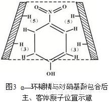 平衡常數(shù)Km:n(或稱穩(wěn)定常數(shù))是描述溶液中環(huán)糊精包合物的穩(wěn)定性指標(biāo),通??捎米贤夤庾V、X射線衍射法和核磁共振等方法測(cè)定。其中核磁共振能可直接觀測(cè)主客體分子中各個(gè)原子的變化,因而對(duì)包合物的結(jié)構(gòu)分析,主客體結(jié)合部位的推定,以及包合機(jī)理等方面的研究發(fā)揮巨大的作用。核磁共振氫譜對(duì)客體分子在環(huán)糊精的空腔中包合位置能提供最直接的證據(jù)。而客體分子在環(huán)糊精空腔中方位取向,可以用測(cè)定客體分子的核磁共振氫譜和碳譜,由包合前后的化學(xué)位移變化來推定。例如:α-環(huán)糊精與對(duì)硝基酚的包合結(jié)晶構(gòu),其主、客體分子的位置如圖3所示??腕w分子的疏水性硝基進(jìn)入了主體分子的中空內(nèi)腔,而親水性的羥基則露出于腔口外。主體分子內(nèi)腔側(cè)的氫原子和客體分子的苯環(huán)上的氫原子之間距離,比氫原子的通常的范德華力半徑之和要小些,這顯示主、客體之間存在較強(qiáng)的相互作用。