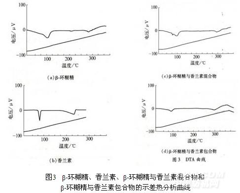在β-環(huán)糊精的DTA曲線上100℃出現(xiàn)加熱脫水吸熱峰,在300℃左右為β—環(huán)糊精熔點;香蘭素的DTA曲線在82℃處有熔點吸收峰;β-環(huán)糊精與香蘭素混合物的DTA曲線上基本上再現(xiàn)了β-環(huán)糊精與香蘭素的特征峰,可是在β-環(huán)糊精與香蘭素包合后沒有出現(xiàn)香蘭素熔點峰,表明香蘭素的熱穩(wěn)定性得到了提高。