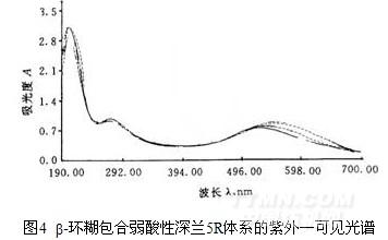 在染料液中加入環(huán)糊精后,染料分子的最大橫截面尺寸與空腔匹配的染料分子或其部分基團,一旦進入環(huán)糊精的疏水性空腔發(fā)生包合作用,就可能引起其吸收光譜的變化。這主要是染料分子共軛體系的電子云密度受到了腔中較高電子云的微擾,引起共軛體系電子躍進能降低及吸收強度增加,從而導致吸收光譜的吸收度增強及最大吸收波長的紅移。據(jù)文獻介紹(24)弱酸性深蘭5R(C.1、Acid Blue 113)溶液中加入不同量β-環(huán)糊精,在60°恒溫振蕩包合處理后,其紫外—可見光譜圖,如圖4所示