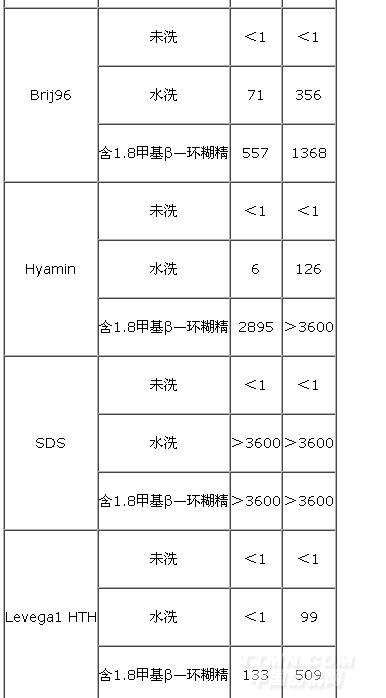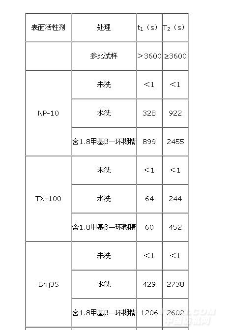 由表4可知,滌綸參比試樣,經(jīng)一般水洗后和徹底水洗后,試樣的潤濕時間均大于3600秒,表明滌綸纖維是疏水的。經(jīng)表面活性劑處理后,潤濕時間均小于1秒;經(jīng)兩種不同洗滌工藝洗滌后,表明用含環(huán)糊精水洗的能更有效去除滌綸纖維表面上的表面活性劑。