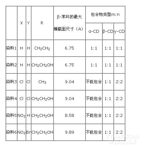 T.Shibusawa等人研究了3種環(huán)糊精(α、β和γ)對6只4-氨基-4′硝基偶氮苯類分散染料的包合試驗(26),其結(jié)果如表5所示。