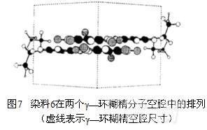 由表5 可知,α—環(huán)糊精可與染料1~2形成1:1包合,對染料3~6四個染料幾乎不能包合,與這些染料的β—苯環(huán)最大橫截面遠大于α—環(huán)糊精空腔尺寸(見表1)直接有關(guān)。β—環(huán)糊精與染料1~6能形成1:1包合物。γ—環(huán)糊精與染料1和2(沒有取代基的染料)能形成1:1包合物,而β—苯環(huán)2′或2′和6′位有龐大的拒電子基團的染料3~6,卻可與γ—環(huán)糊精形成2:2包合物。而且2:2包合反應(yīng),使λmax紅移了9.5~51nm和非常大的-△H°值,表明在包合過程中發(fā)生了穩(wěn)定的偶極結(jié)構(gòu)的強烈放熱的相互作用。由此,可設(shè)想兩個染料分子包合在兩個連接的γ—環(huán)糊精的長空腔中,是一個染料分子的富電子α—苯環(huán)對著另一個染料分子缺電子的β—苯環(huán),其2:2包合物的模型,如圖7所示。由于2:2包合物的-△H°值大,很適合用于緩染作用。
