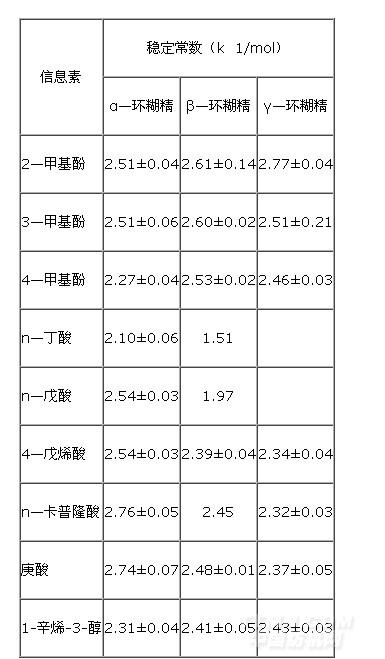 汗液中的信息素與環(huán)糊精在25℃水溶液中形成包合物的穩(wěn)定常數(shù),經(jīng)測(cè)定如表9所示: