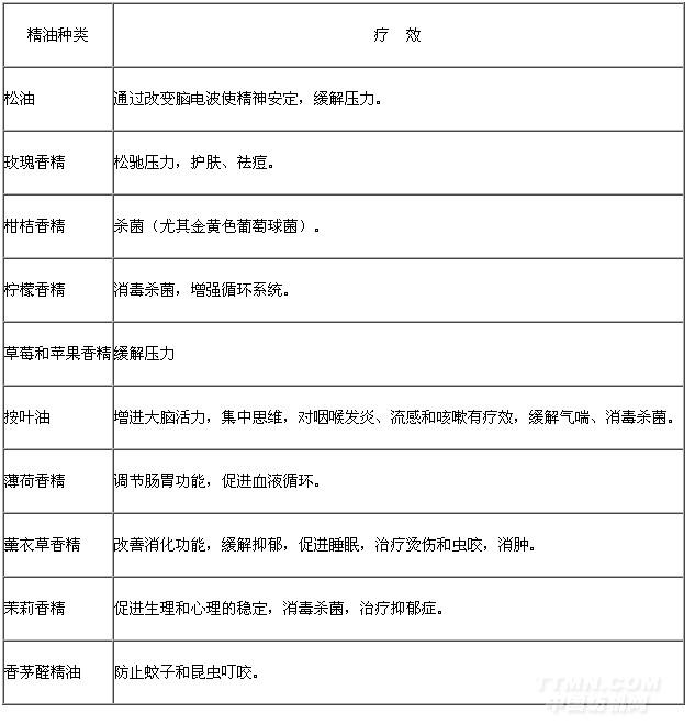 由于工業(yè)化飛躍發(fā)展,人們對(duì)自然界資源掠奪性開(kāi)采,形成對(duì)生態(tài)環(huán)境的災(zāi)難。致使人們不得不開(kāi)始反思,在回歸自然、追求健康的浪潮下,森林浴和芳香治療悄然成為城市生活一種時(shí)尚,各種加香產(chǎn)品的蓬勃興起也成為一道風(fēng)景線(xiàn),順應(yīng)這種趨勢(shì)具有芳香保健功能的紡織品的開(kāi)發(fā)也受到業(yè)界同仁們的關(guān)注。科學(xué)研究表明,許多芳香精油具有鎮(zhèn)靜、殺菌和保健等作用。人們又進(jìn)一步發(fā)現(xiàn)某些芳香植物精油還具有一定的藥用功效,可提供一些生理和心理方面的輔助療效(52)。如表10所示