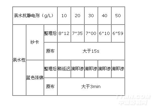 4.1親水抗靜電劑的不同用量對(duì)織物親水效果的影響(結(jié)果見表1):