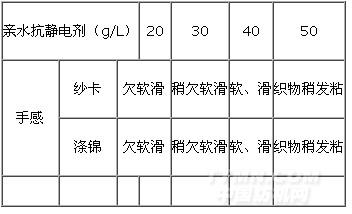 4.2親水抗靜電劑的不同用量對(duì)織物手感的影響(結(jié)果見表2):