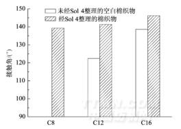 采用辛基三甲氧基硅烷(C8)、十二烷基三甲氧基硅烷(C12)和十六烷基三甲氧基硅烷(C16)分別作為低表面張力物質(zhì)賦予棉織物拒水性。將未經(jīng)Sol 4整理的空白棉織物和經(jīng)Sol 4整理的棉織物浸漬在2%的不同結(jié)構(gòu)硅氧烷的水解液中,織物與水的接觸角變化見圖2。