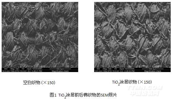 棉織物經(jīng)TiO2涂層前后的SEM照片如圖1所示。由圖1可知,經(jīng)TiO2涂層后,在織物表面形成了一層致密的PVDF-TiO2高分子膜,PVDF和TiO2填充了纖維交織點間空隙,使紗線結(jié)構(gòu)變得較為緊密。