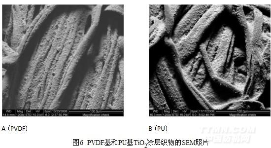 圖6為PVDF基和PU基TiO2涂層織物的SEM照片