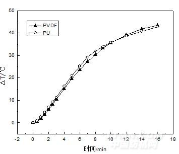 由圖7可知,在輻射時(shí)間內(nèi),PVDF基和PU基TiO2涂層織物的輻射時(shí)間——溫度變化曲線極為相似。所不同的是,在前10 min的輻射時(shí)間內(nèi),PU基TiO2涂層織物的內(nèi)側(cè)溫度增加量高于PVDF基的,PVDF基TiO2涂層織物的隔熱性能優(yōu)于PU基的;而輻射10 min后,PVDF基TiO2涂層織物的內(nèi)側(cè)溫度增加量高于PU基的,PU基TiO2涂層織物的隔熱性能優(yōu)于PVDF基的。這可能與PVDF基TiO2和PU基TiO2在織物上具有不同的分布狀態(tài)有關(guān)。PVDF基TiO2在織物上分布較密集,其在織物上的附著量明顯多于PU基TiO2的。在短的輻射時(shí)間內(nèi),由于PVDF基TiO2涂層織物表面附有一層密集的對(duì)熱輻射具有較強(qiáng)反射作用的TiO2,致使熱輻射較難透過(guò)織物進(jìn)入內(nèi)側(cè),形成累積,所以其隔熱性能較好。但經(jīng)較長(zhǎng)時(shí)間輻射后,由于PU基TiO2涂層織物和PVDF基TiO2涂層織物上的TiO2粒子對(duì)熱輻射具有同等的反射效果,而PVDF基TiO2涂層織物上富余的TiO2粒子會(huì)對(duì)熱輻射產(chǎn)生吸收,吸收的能量通過(guò)熱傳導(dǎo)進(jìn)入織物內(nèi)側(cè),形成累積,所以其內(nèi)側(cè)溫度增加較多,但區(qū)別不大。