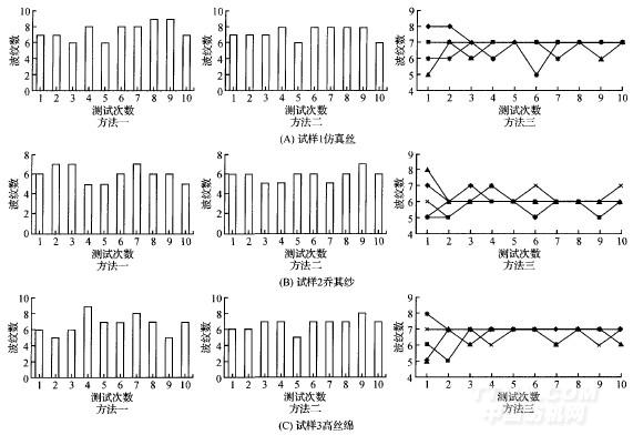 根據(jù)上述三種方法測(cè)得的5種試樣的靜態(tài)懸垂形態(tài)圖及其懸垂形態(tài)參數(shù),以波紋數(shù)為例來(lái)進(jìn)行具體分析。