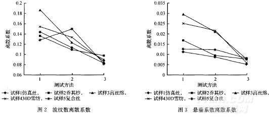 離散系數(shù)又稱(chēng)變異系數(shù),是衡量各觀測(cè)值變異程度的一個(gè)統(tǒng)計(jì)量。當(dāng)進(jìn)行兩個(gè)或多個(gè)觀測(cè)值變異程度的比較時(shí),如果度量單位與平均數(shù)相同,可以直接利用標(biāo)準(zhǔn)差來(lái)比較。如果單位或平均數(shù)不同時(shí),需采用標(biāo)準(zhǔn)差與平均數(shù)的比值來(lái)比較。本文中三種方法所涉及的總測(cè)試次數(shù)不同,因而在計(jì)算離散系數(shù)時(shí)選用后者。圖2和圖3分別顯示了5種試樣在方法一、方法二和方法三下波紋數(shù)和懸垂系數(shù)的離散系數(shù)。