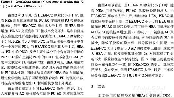 基丙烯酸甲酯、三羥甲基丙烷三丙烯酸酯為丙烯酸酯類單體,偶氮二異丁腈為引發(fā)劑合成了丙烯酸酯改性水性聚氨酯(PU-AC)乳液.建立并驗(yàn)證了使用PU和PAC的共溶劑四氫呋喃測(cè)定產(chǎn)物的交聯(lián)度并計(jì)算PU對(duì)AC的接枝率.隨著反應(yīng)溫度的提高,HEA與PU預(yù)聚體中NCO的反應(yīng)性增加,體系中最終殘余NCO降低.變化HEA/NCO摩爾比,當(dāng)HEA/NCO低于1時(shí),增加HEA用量使PU接枝率和PU-AC乳膠粒徑逐漸增加;當(dāng)HEA/NCO大于1后,繼續(xù)增加HEA用量對(duì)PU接枝率和PU-AC乳膠粒徑的影響不大.膠膜吸水率隨著HEA用量的增加而明顯降低.