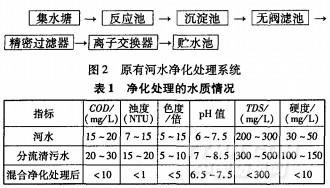 該企業(yè)原外排廢水約6000t/d,對(duì)三個(gè)主要色種(大紅、寶藍(lán)、翠綠)的染色過(guò)程進(jìn)行跟蹤分析,并測(cè)定每一工序外排水的水質(zhì)。結(jié)果表明,棉針織物染色后的洗溢流水工序及后續(xù)的5道水洗工序中,約有l(wèi)500m/d的排水COD低于30mg/L,色度低于5倍,與取水水質(zhì)相當(dāng)。基于這種情況,車(chē)間廢水實(shí)行清濁分流,將清污水部分分流至廠內(nèi)河水貯水塘,與河水混合后進(jìn)入原水凈化系統(tǒng)處理,凈化工藝見(jiàn)圖2。混合后清水經(jīng)凈化處理后水質(zhì)見(jiàn)表l。