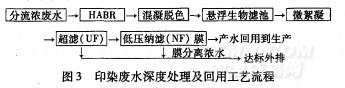 圖3印染廢水深度處理及回用工藝流程廢水經(jīng)高效低耗的HABR一混凝脫色懸浮生物濾池聯(lián)合工藝處理后,出水水質(zhì)優(yōu)于一級(jí)排放標(biāo)準(zhǔn);再采用微絮凝一超濾膜預(yù)處理工藝,以最大限度地降低廢水濁度、色度和有機(jī)污染物濃度,提高進(jìn)膜水質(zhì)要求;最后采用低壓NF膜分離技術(shù)脫除無(wú)機(jī)鹽和殘余的有機(jī)物,低成本地實(shí)現(xiàn)廢水的循環(huán)利用。