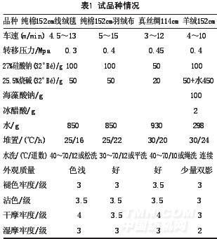 無錫市的色織廠引進(jìn)了該機(jī),從Dansk公司提供的400多個(gè)樣布看,無論在品質(zhì)或圖案質(zhì)量上,均達(dá)到國際一流水平。按照正常工藝要求在20℃以上的室溫下進(jìn)行轉(zhuǎn)移印花,并在40℃以上的溫濕狀態(tài)堆置。該廠試生產(chǎn)是在0℃左右進(jìn)行的,在一定程度上影響了產(chǎn)品質(zhì)量效果。試品種情況見表1