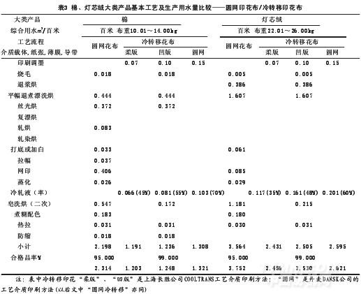 表2中就印花工藝對(duì)比,圓網(wǎng)印花工藝的水、電百米消耗量最高,萬元產(chǎn)值的水、電消耗量更高,說明其它三種印花產(chǎn)品附加值高。