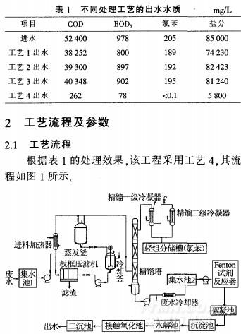 該化工廠廢水排放量約為10t/d。COD為52400mg/L左右,氯苯為205mg/L左右,鹽分約為85000mg/L,pH約為6。